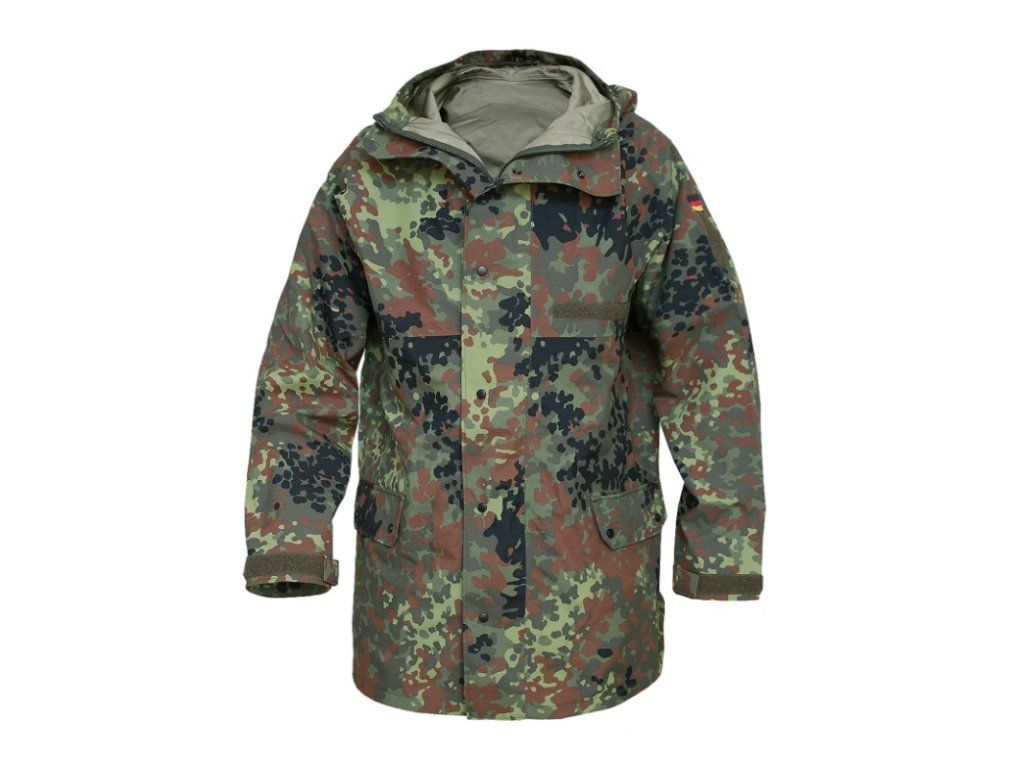 Nepromokavý goretexový(trilaminát) Originál BundesWehr, použité. kapsy 2x venkovní, zapíníní na zip nebo druky kovové. Kapuce se stahující šňůrkou dobře chrání před nepříznivým počasim.velikosti 44/46,48/50,52/54,56/58